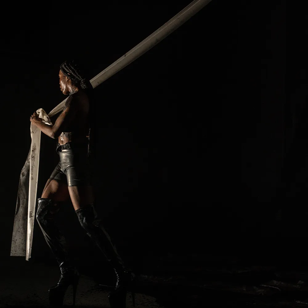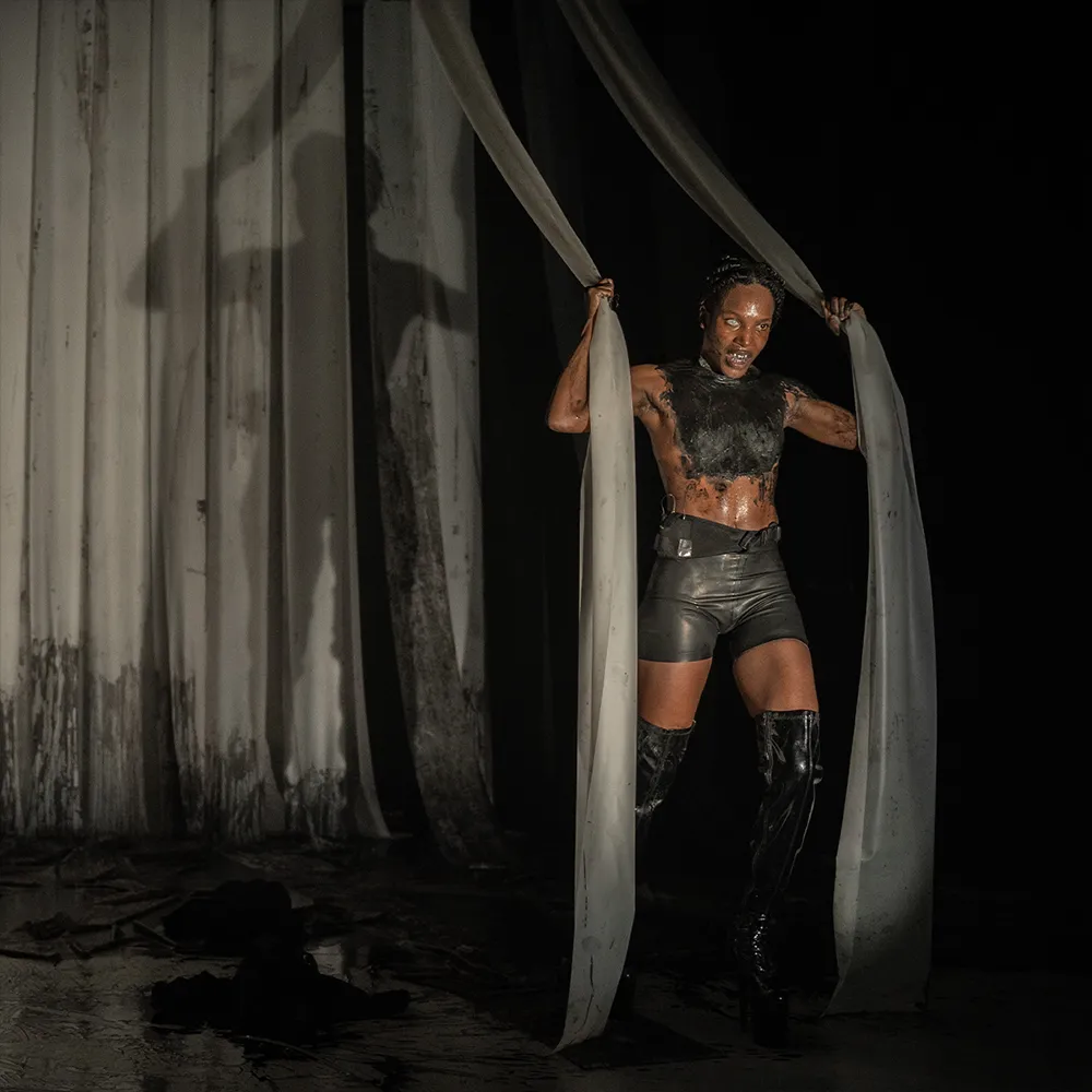 Her creation DARKMATTER (2022), a duet with Camilo Mejía Cortés, continues her exploration of black bodies and their representations, through a striking aesthetic where beauty, strangeness, and sound distortion intersect.