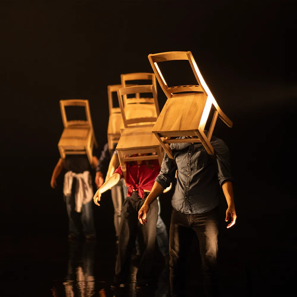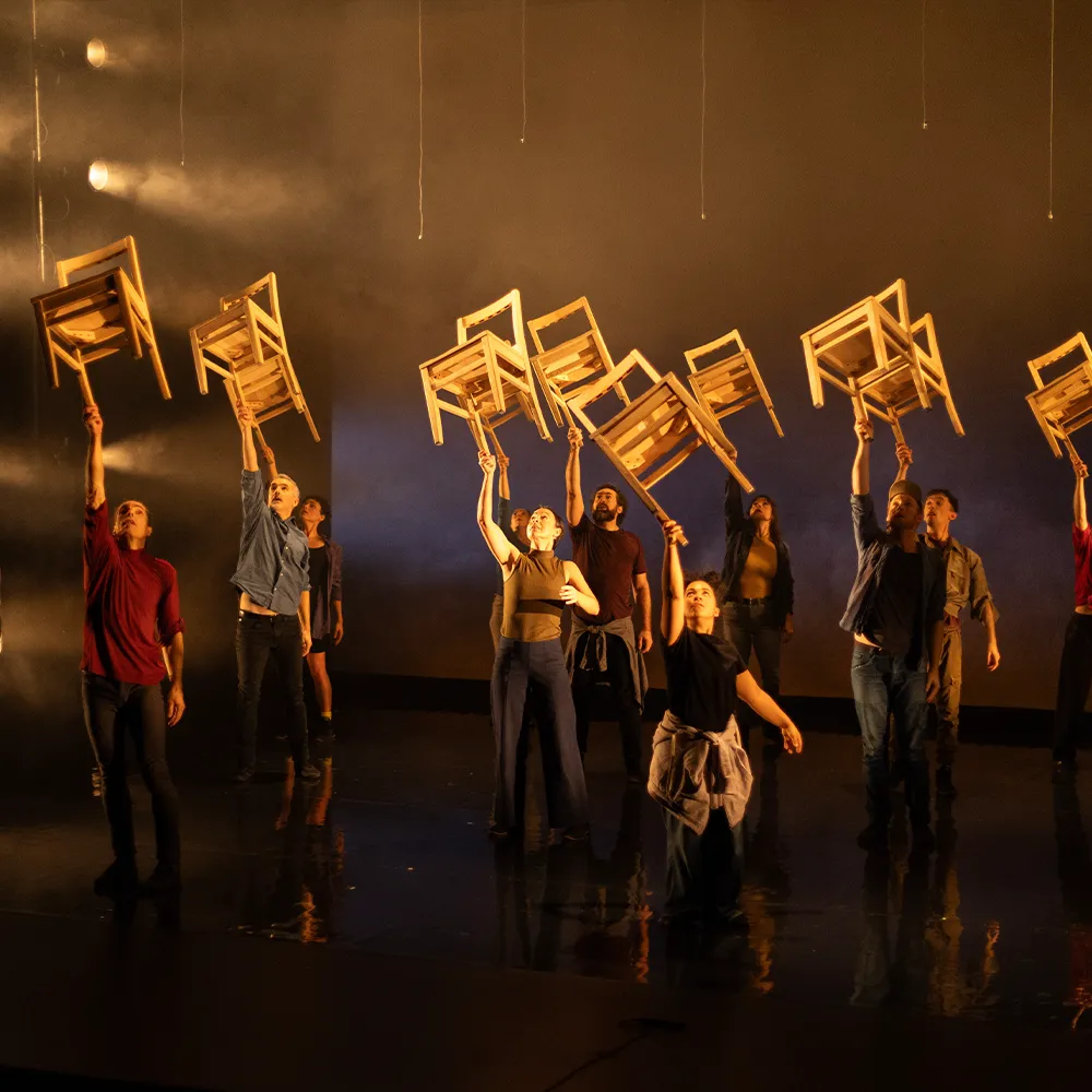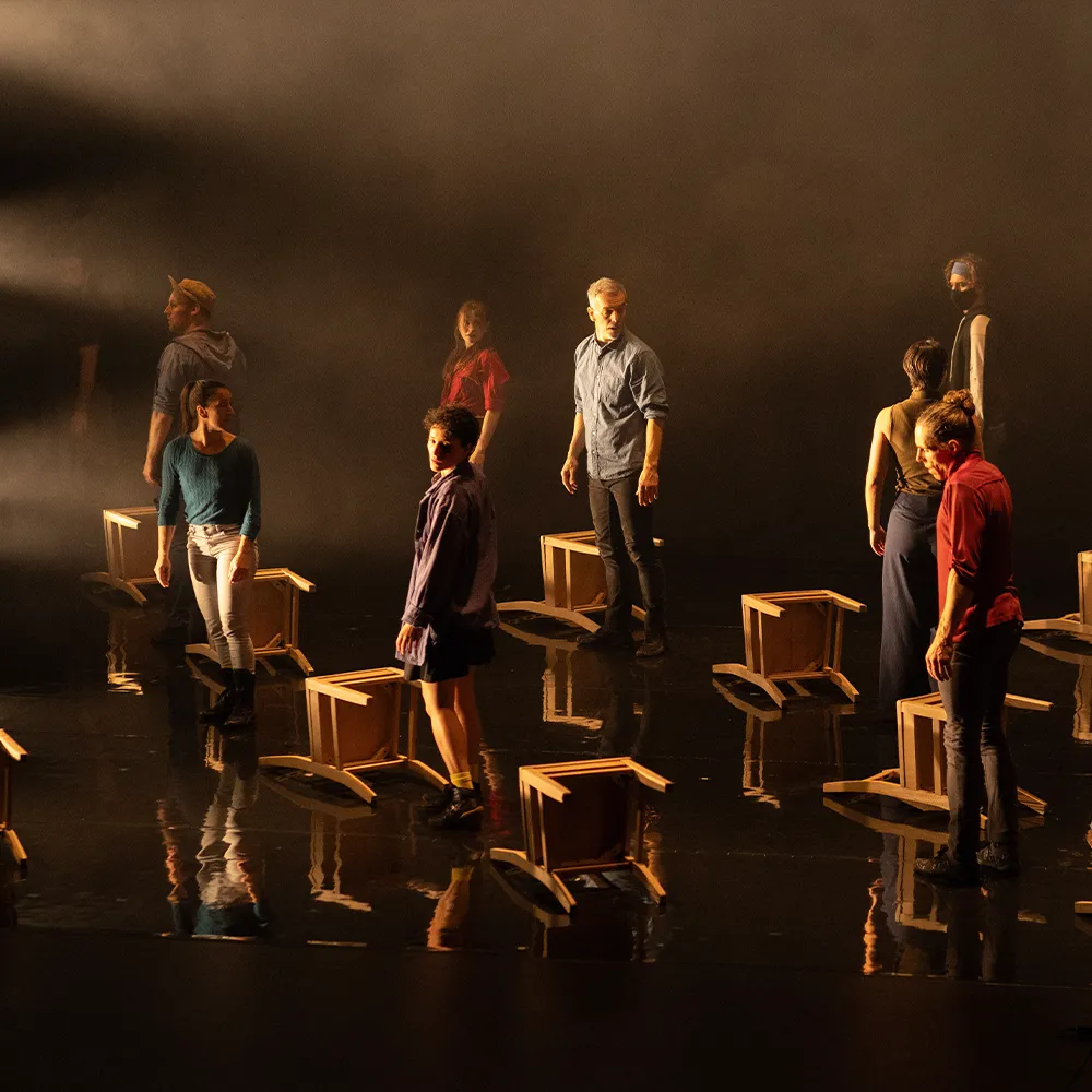 Inspirée par la physique classique et quantique, En théories (une poétique de l’espace-temps) est une œuvre à grand déploiement qui explore les thèmes de la temporalité, de l’espace, de l’univers. Fasciné par les étoiles, un groupe de douze (12) interprètes racontent la vie de mille et une façons, dévoilent la matière qui nous compose, incarnent la vitesse de la lumière et dépeignent l’intrication de nos vies et l’amour qui nous tient ensemble avec quarante-quatre (44) chaises.